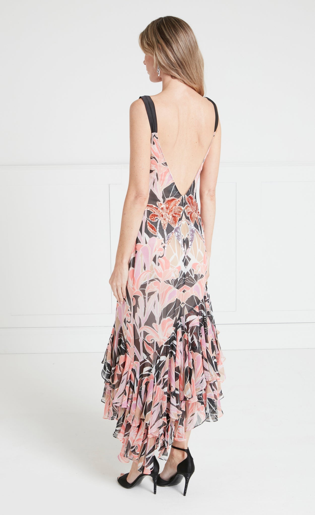 The Alani Ruffle Dress is a slip-style silhouette with a fluid, asymmetric ruffle skirt crafted from a semi-sheer, printed georgette. Blending modern design with the elegance of traditional flamenco dresses, the ruffles offer movement and playfulness with subtle texture and sparkles.