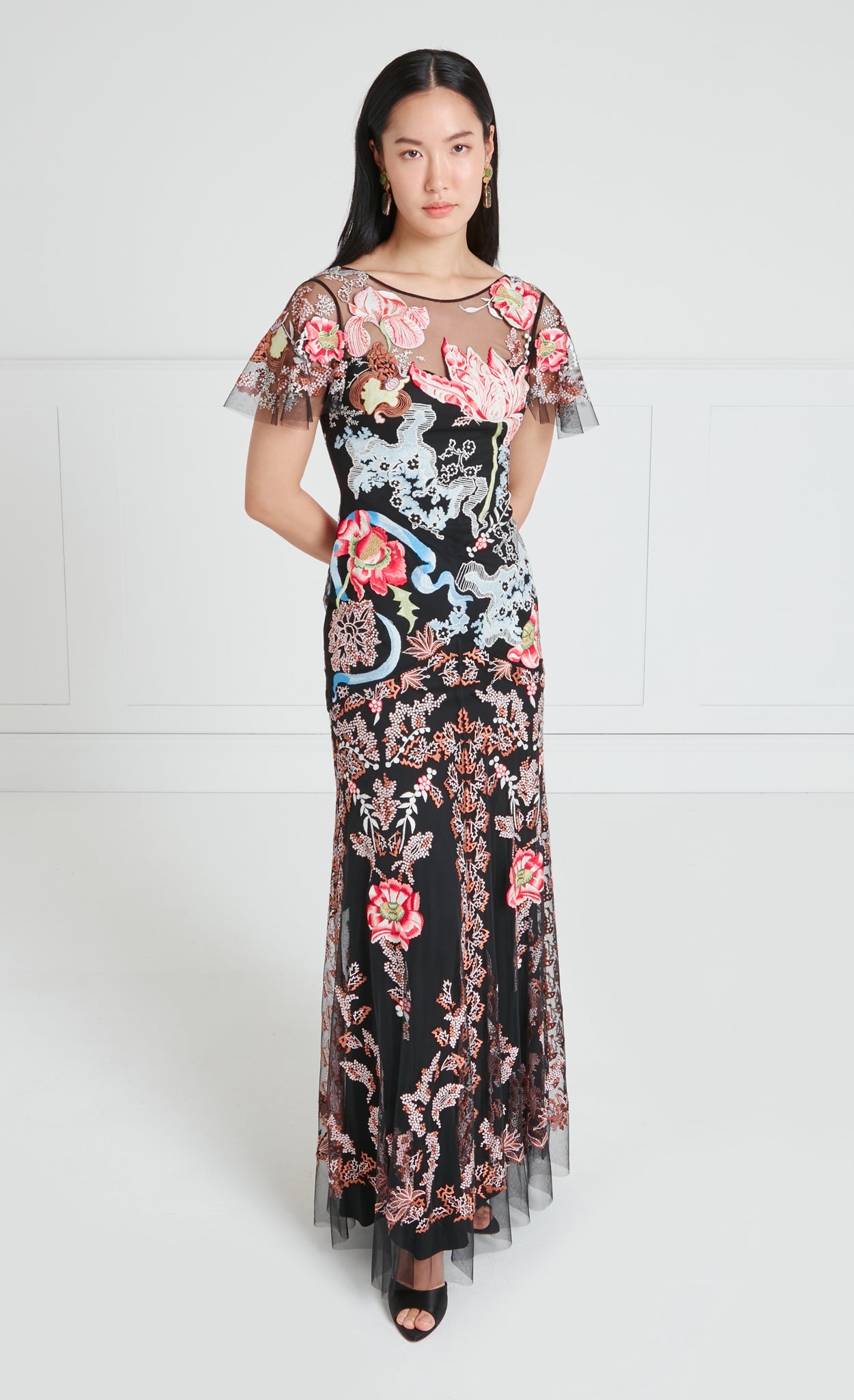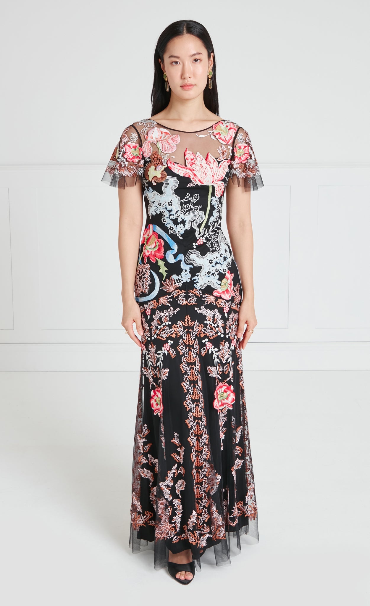 The Bilbao floor-length gown is a graceful and etheral design featuring all-over embroidery. Softly layered tulle creates volume and lightness, while stretch double georgette beneath ensures a flattering, comfortable fit. Short flared sleeves add playful refinement, balancing the gown¡¯s romantic flow ¨C perfect for evening occasions that call for timeless elegance.