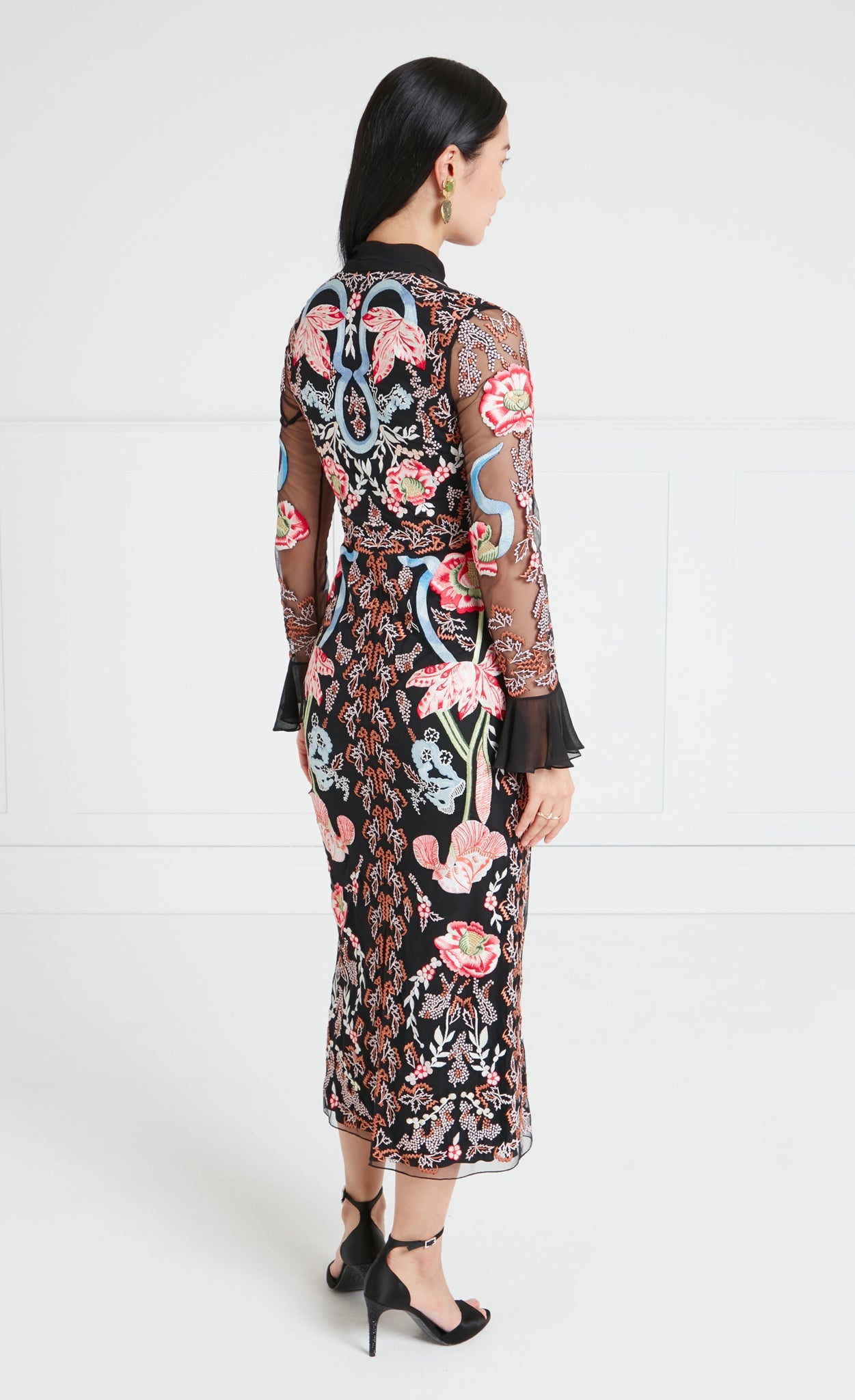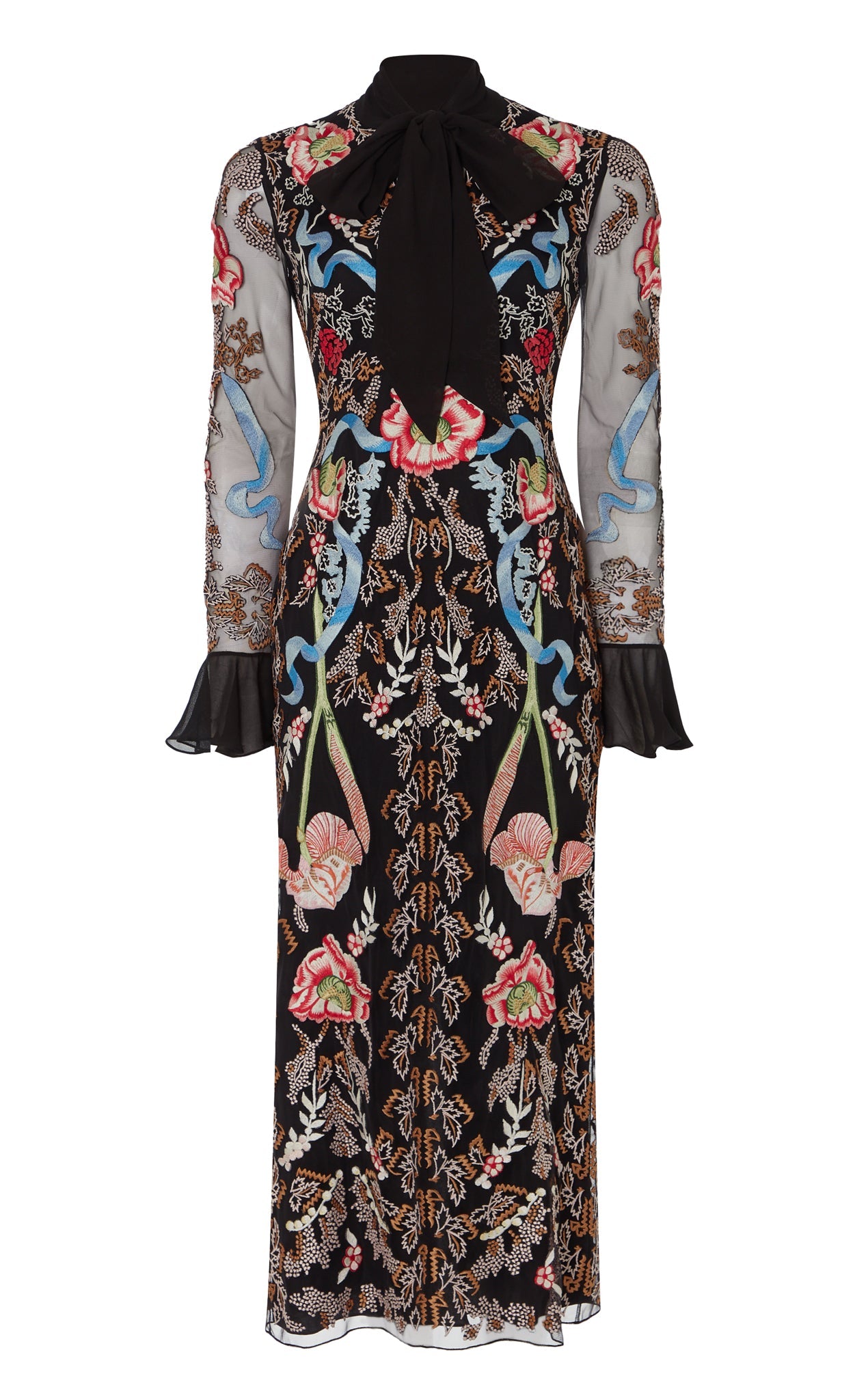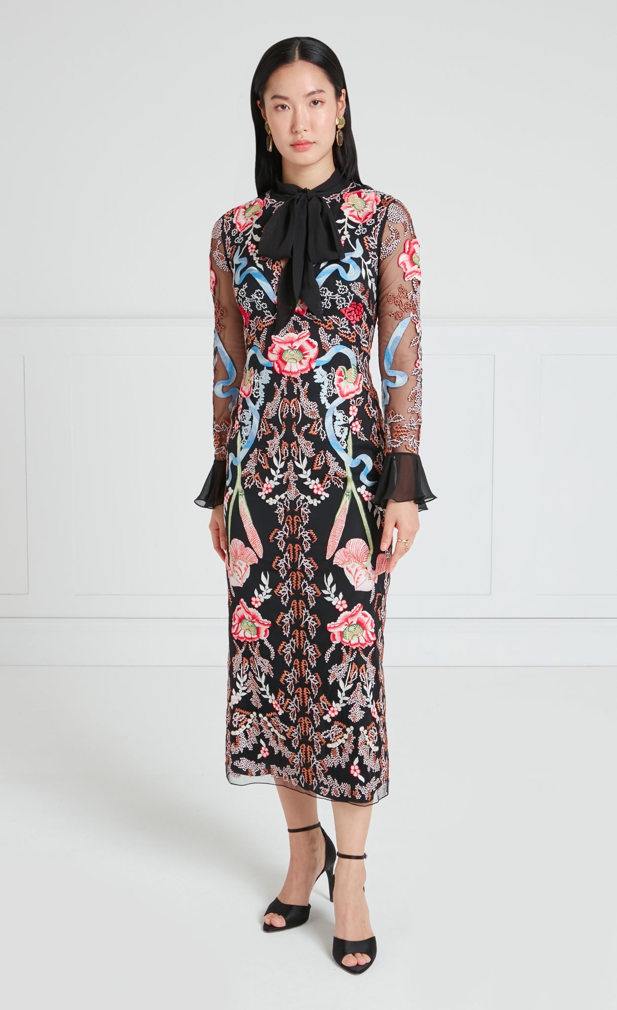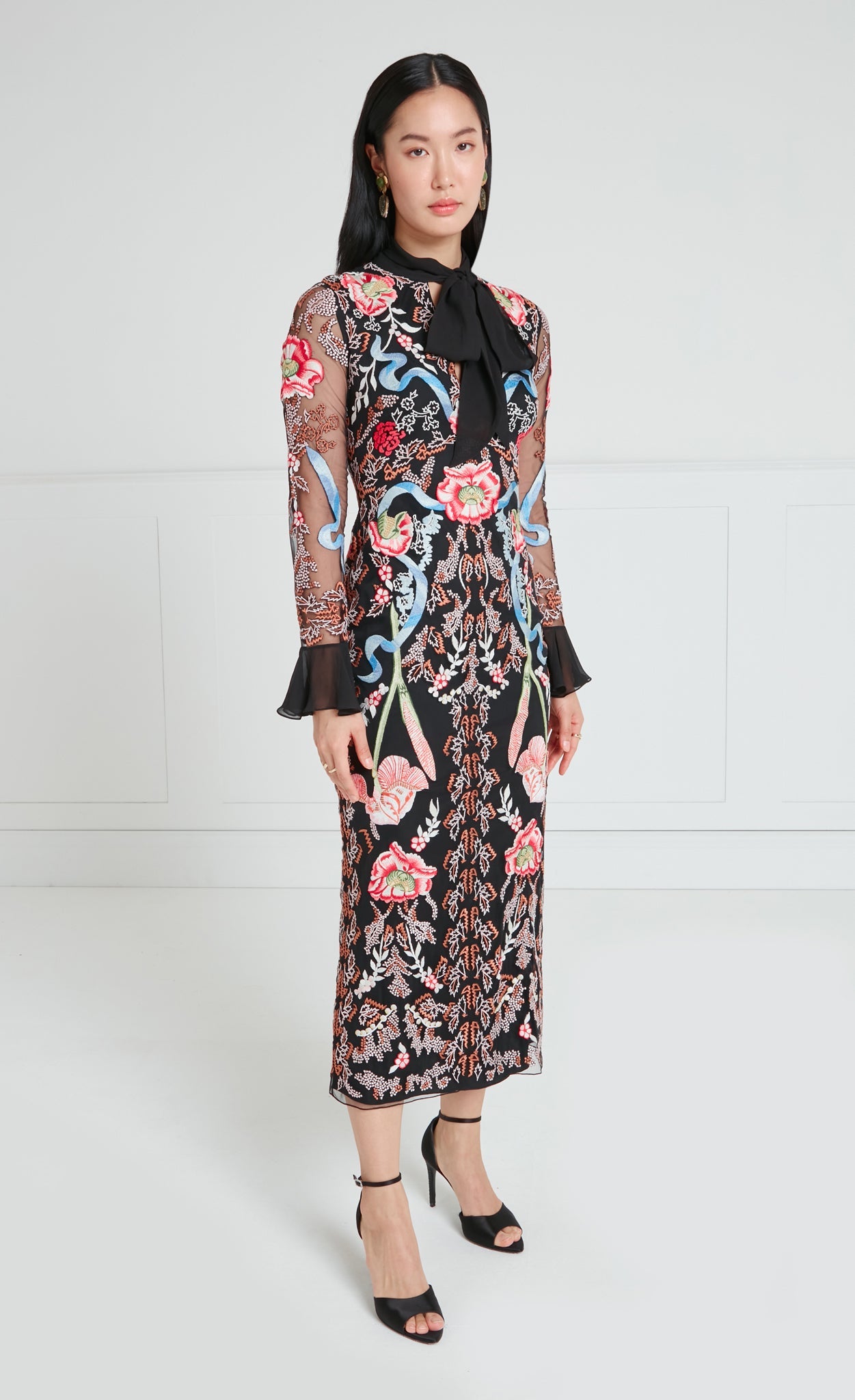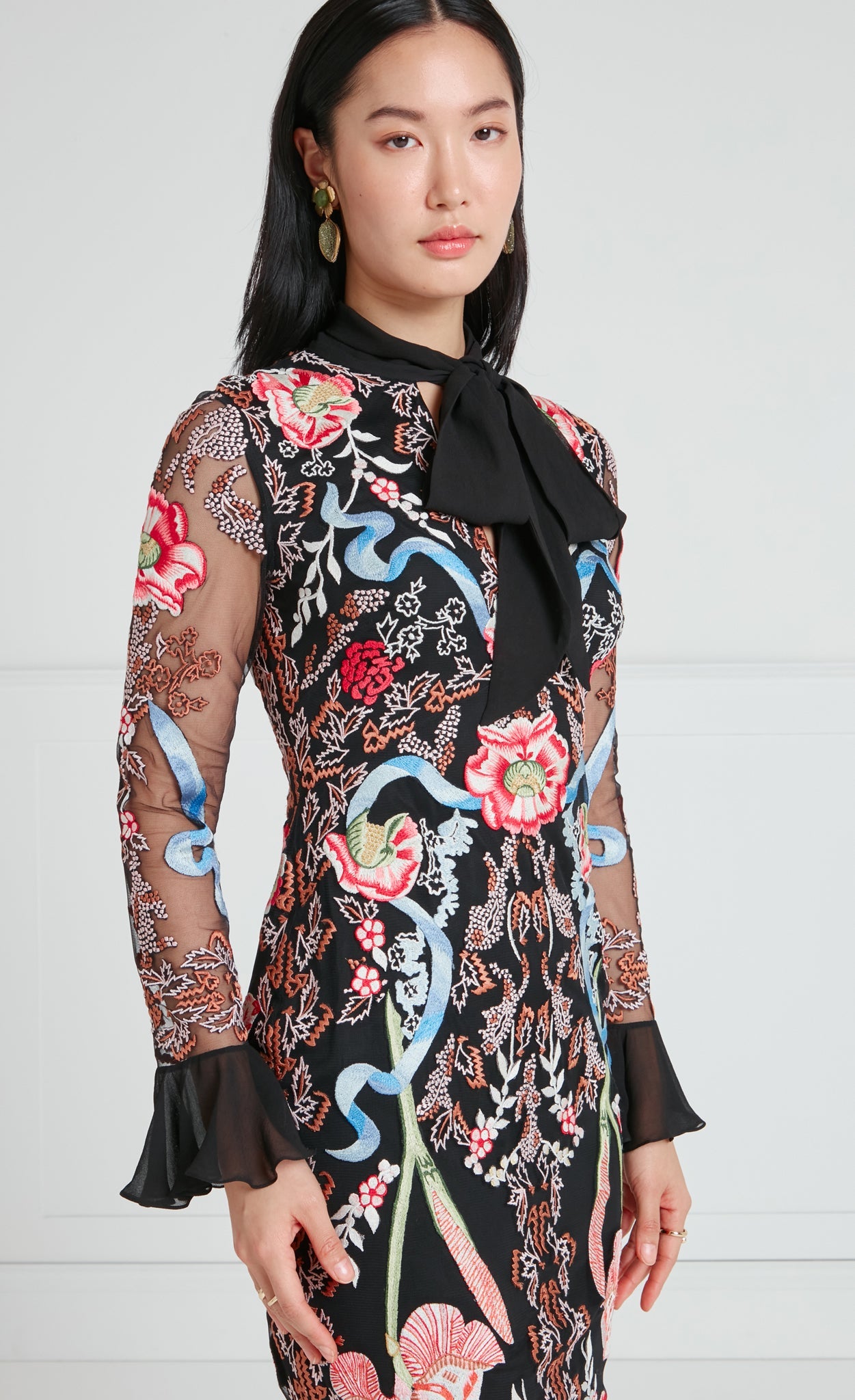The statement-making, cocktail-length Bilbao tie dress features all-over floral embroidery. It is designed with a feminine bow tie neck and softly flared cuffs, creating elegant volume and movement. The silhouette is versatile for special occasions and distinctive enough to stand out.