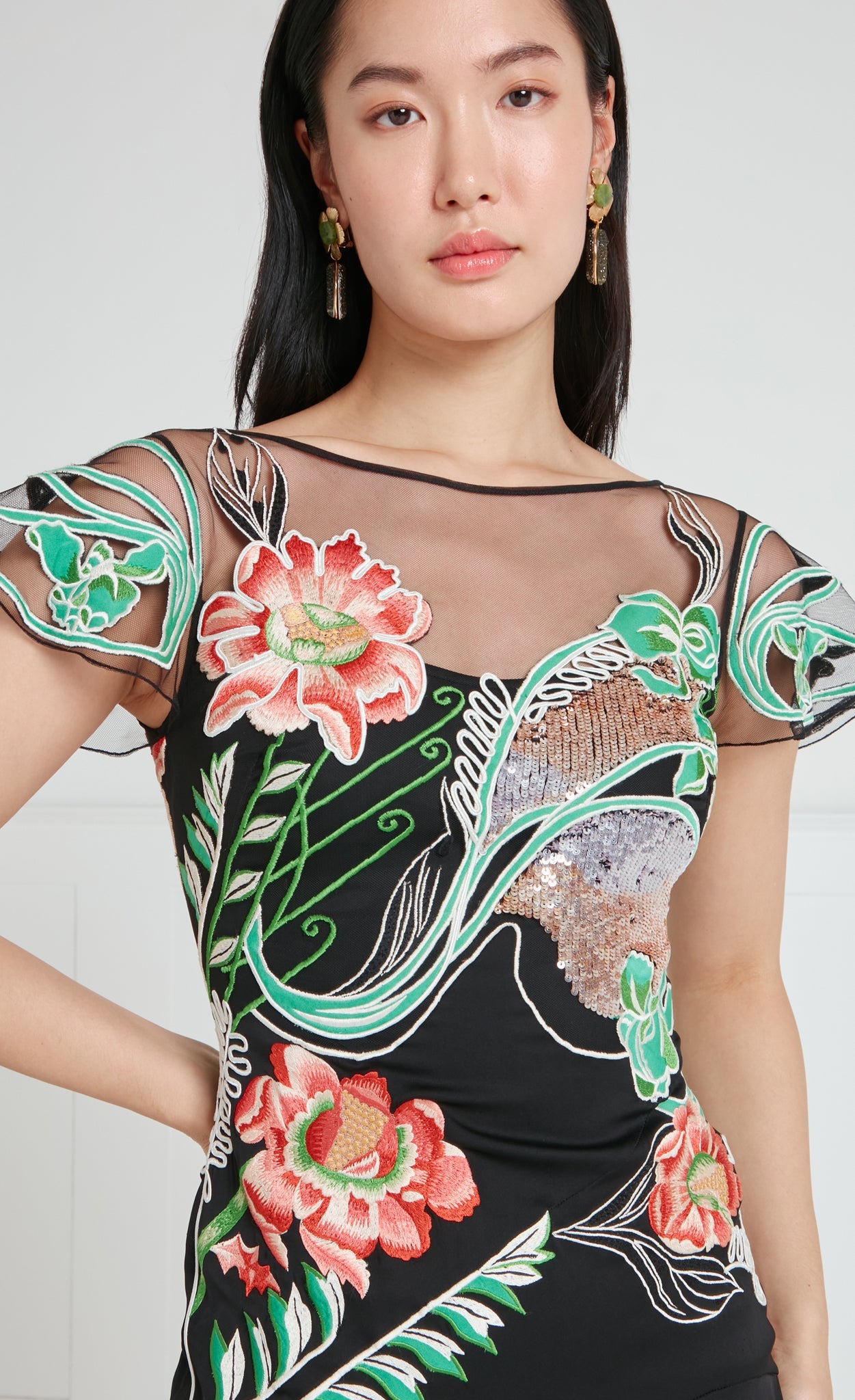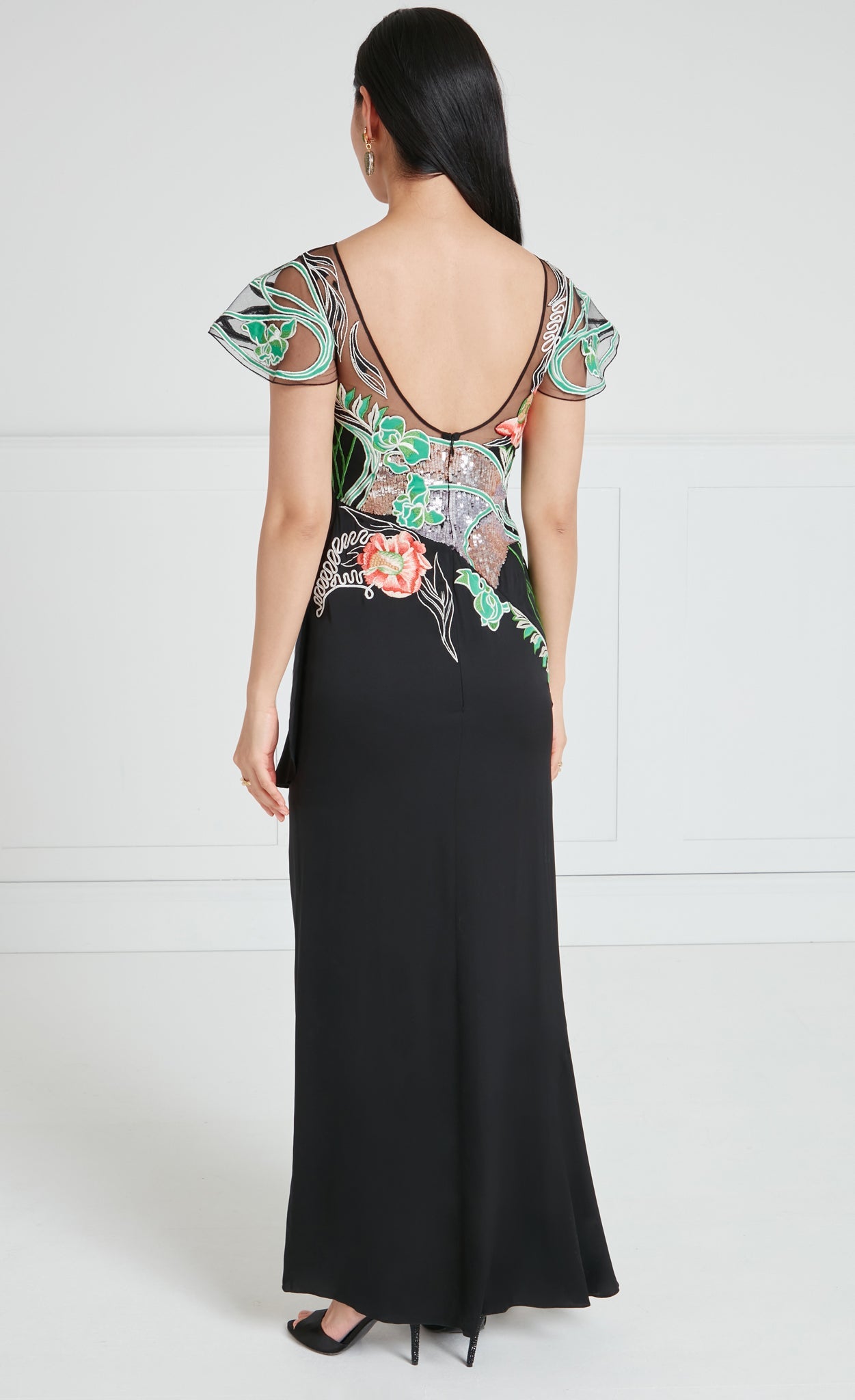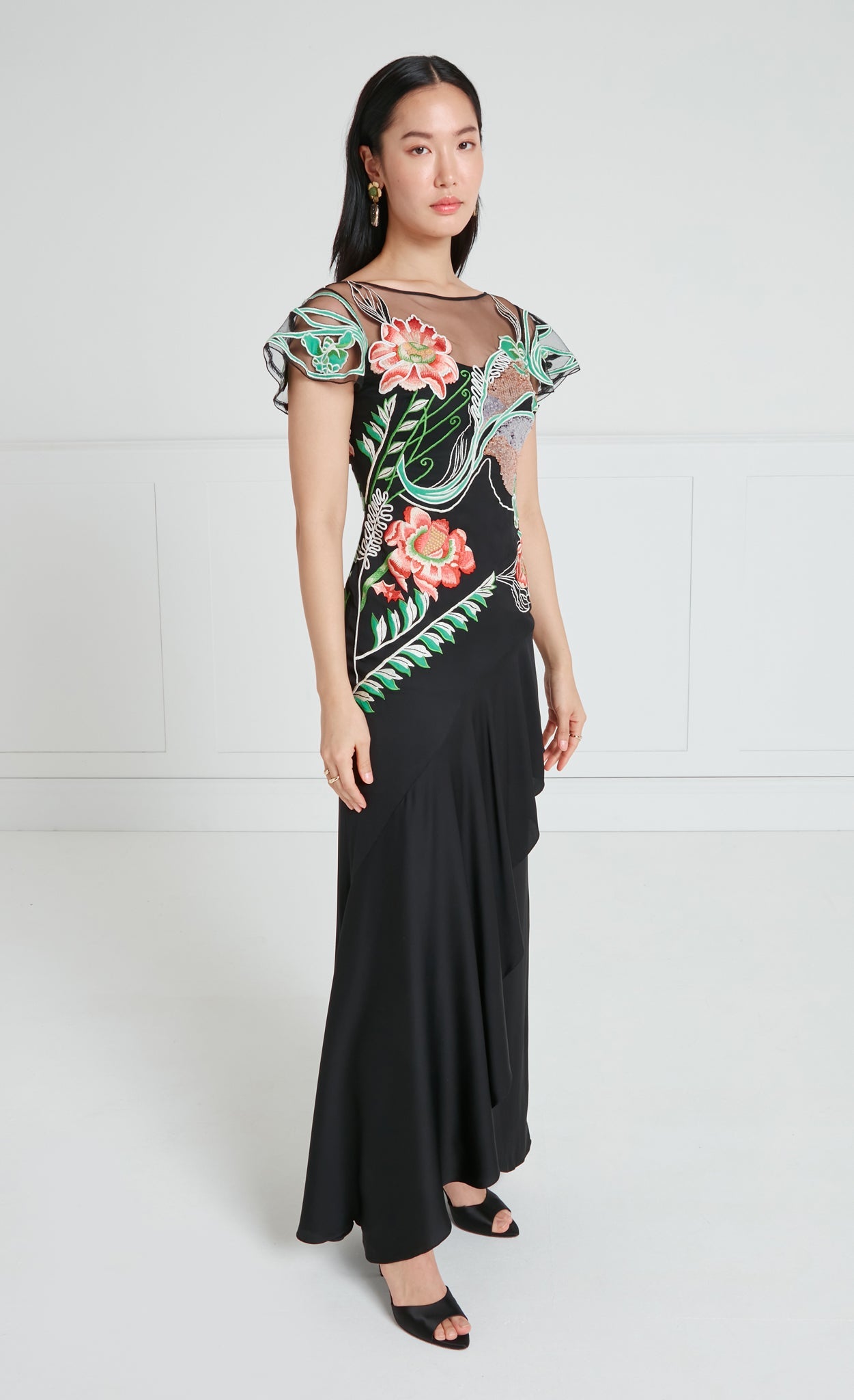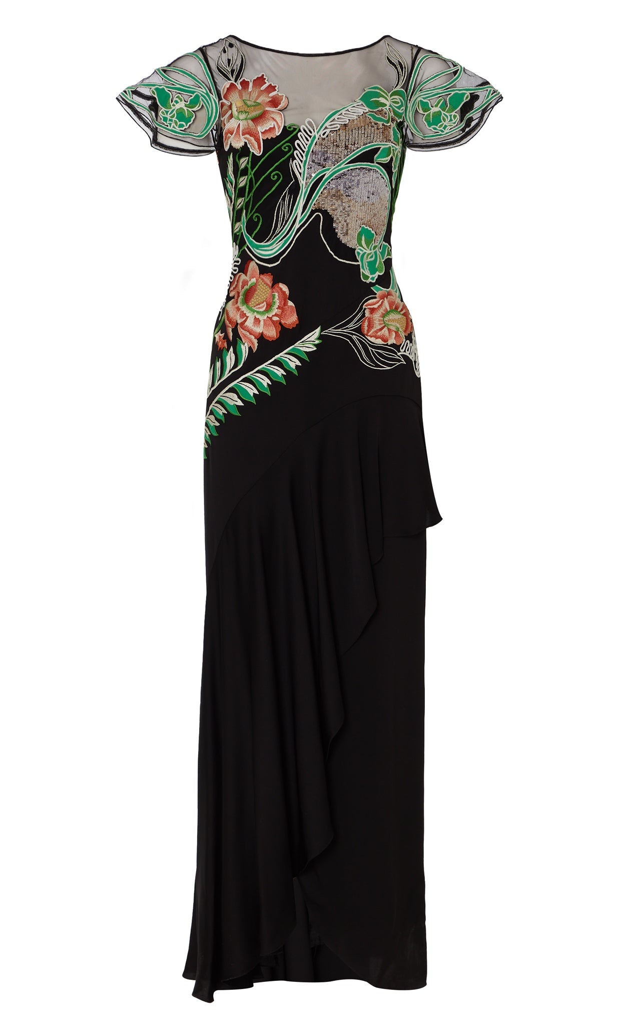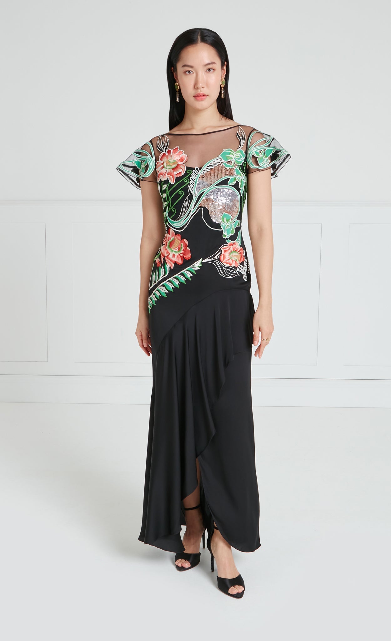 The asymmetric Gracia Ruffle Gown is designed to make an entrance. The bodice is intricately decorated with a blend of stitch and sequin embroidery, featuring large, bold floral motifs that draw inspiration from the decorative and ornate style of Spanish Art Nouveau.